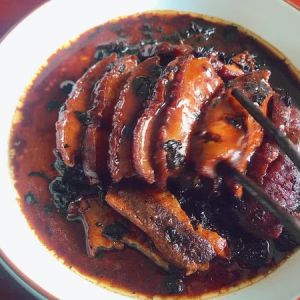 然后把汁水倒在锅里,扣肉反扣在盘里,汁水烧沸后放入水淀粉调至浓稠,浇在扣肉上即可