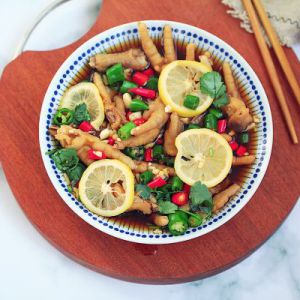 加入蚝油、生抽、米醋、少许糖、盐、水。量要以能没过鸡爪为宜才能入味。可以尝尝口味,调成自己喜欢的酸辣咸度。