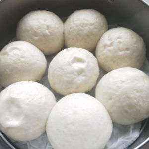 揉好的馒头摆在笼布上,放在提前烧好热水的锅上面二次发酵十五分钟