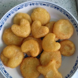在锅中放油加热,小火,将捏好的土豆形状放在锅中,煎到双面金黄色,捞出。