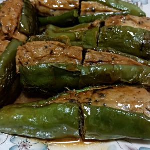 油锅爆香姜片,然后放入辣椒酿,煎成虎皮状