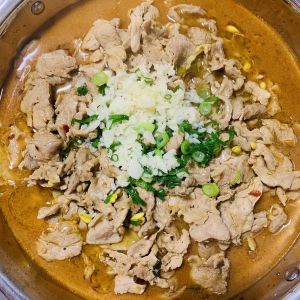 肉片煮好后连汤汁一起倒入盘中,上面加上准备好的蒜末和葱末
