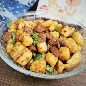 再把馒头切成小丁,也把牛肉肠切成滚刀块。