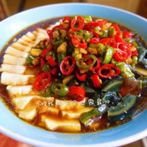 一定要让所有的皮蛋和豆腐都浇到汤汁哦,这样吃起来才有味道。辣椒放在中间做装饰