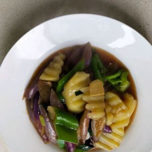 青椒切块,香葱葱白做葱花葱叶出锅前与青椒一起放入调味