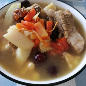 准备砂锅,冷水下锅排骨和葱姜,因为要炖一个半小时以上汤才好喝,所以建议起初多加一些水,后期水不够再加会影响汤的味道。煮骨头四十分钟时加入玉米,五十分钟时加桂圆和灰枣,六十分钟时加胡萝卜和山药,八十分钟时加虫草和枸杞,食材先后顺序可以根据个人喜好调整。