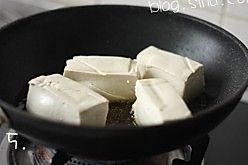 锅中放油烧热,讲豆腐正面朝下放入锅中煎至金黄,翻面继续煎。蚝油,生抽,糖和清水调成汁倒入锅中,盖上盖子小火烧2分钟