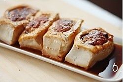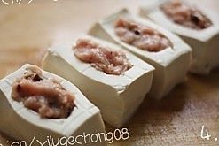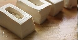 南豆腐切成长方形,中间用小刀挖掉一块备用