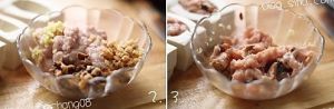 香菇、虾米分别泡好取出切丁,和猪绞肉放一起,加入姜蓉、生抽、盐、糖、白胡椒粉搅拌起胶做成肉馅