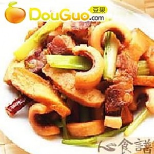 取锅倒入沙拉油加热,放入作法1的五花肉片煸炒至略焦,放入作法1的鱿鱼条炒香,续放入作法1的蒜片、葱段、辣椒片和豆干片炒香,再放入调味料拌炒,最后再放入作法1的芹菜段炒熟即可。