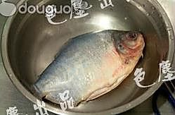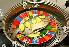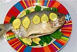 捞出鱼,抹上黄酒、盐和胡椒粉,葱切段,部分放入鱼肚子里,部分铺在盘子上,姜切片码在鱼身上