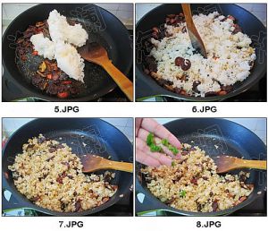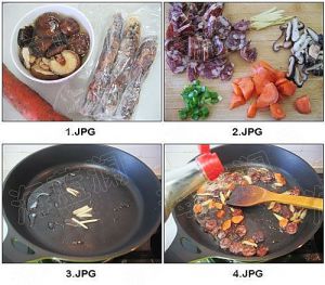 倒入腊肠和香菇翻炒出香味,加入胡萝卜,再加少许料酒。