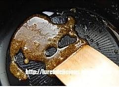 用木铲轻轻地搅炒至白糖溶化,开始是白色泡沫,继续炒至泡沫消失,糖浆由稠变稀,色泽由白变成淡黄至深黄,注意千万别炒焦了,期间要不断搅动。
