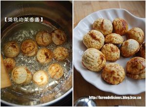 油烧至五成热,放入芋头药炸至金黄皮脆里熟。