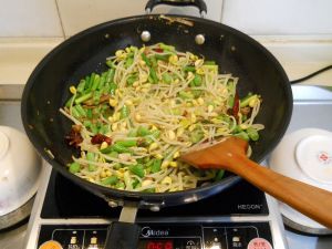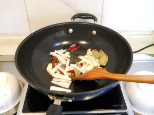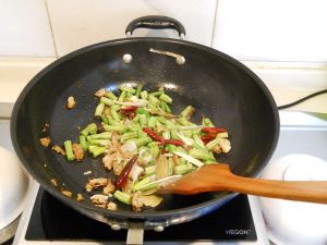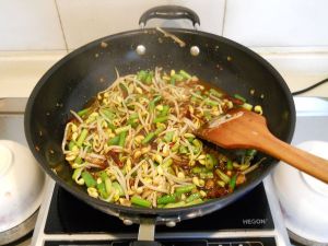 炒2分钟左右导入适量老抽,鸡精,我还加了点蚝油,这个加不加都无所谓,还有加入小半碗水,以没过菜得四分之三为准