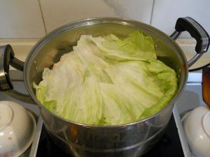 上蒸锅,先把水烧开,外面饭店都是在蒸屉上面铺荷叶,俺们家没有那个玩意,现学现用我就用圆生菜叶子代替的,蒸晚还能吃哦,如果用蒸布的话会 把纱布染色