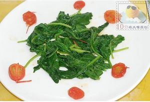 清洗菠菜,切成段~~~清洗小番茄,切成片~~~