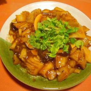 将油放入锅内,热后下入葱姜蒜末炝锅,投入肉片、酱油炒匀,加入水300克,放入精盐、味精、西红柿、炸茄子,开后勾芡即成。