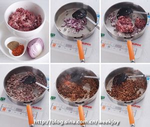 羊肉切碎,稍微剁一下,洋葱切碎。锅里热油,放入洋葱碎爆香,放入肉迅速滑炒开。