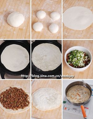 入电饼铛(不放油)烙至两面都起泡。四张都烙好备用。炒好的羊肉加入切碎的香葱拌匀备用。