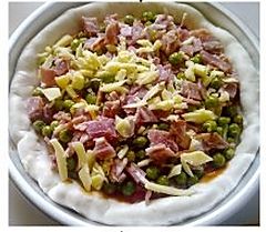 在饼皮上涂一层番茄酱,撒1/3马苏丝;