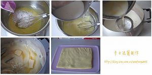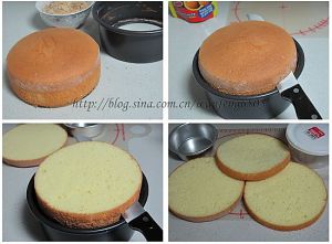 鸡蛋蛋黄蛋白分开,蛋白分3次加糖打至湿性;一个一个加入蛋黄低速搅拌均匀;分两次筛入粉类拌均;温热的奶油先淋到橡皮刮刀上再淋到蛋糊中搅拌均匀;倒入烤模。烤箱175度,中层,25分钟,出炉后晾凉分成三片。