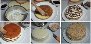 组装:卡士达酱与淡奶油混和,蛋糕片上刷上咖啡糖酒液,涂上一层卡士达奶油,撒上栗子撒,再摆上蛋糕片,刷上咖啡糖酒液,涂满卡士达奶油,粘上杏仁片即可。冷藏3小时后食用。