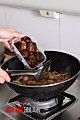 大火翻炒至牛腩变色 → 加入 料酒 糖 八角 → 翻炒均匀;
