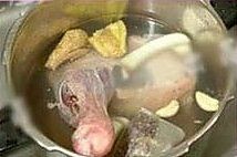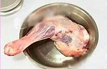 羊腿温水冲洗,用刀刮去浮油和赃物,再次冲洗干净;