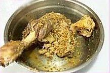 腌制好的羊腿取出,打上花刀,抹上蜂蜜水、辣椒粉,补些孜然;