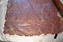 铺一层锡纸,在锡纸表面轻刷一层薄油,将肉茸放在锡纸上平铺均匀,再盖上一层保鲜膜,用擀面杖擀制成薄厚均匀的长方形肉片。