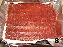 撕去保鲜膜,将肉脯放在烤盘上,烤箱预热,180度先烤制8分钟。