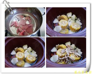 电炖锅烧开水,放入胡萝卜块、冬瓜块、玉米块、瘦肉片和姜片,煲至水沸转小火煲半小时,下入盐调味即可。