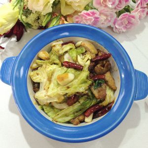 下入事先炒软的牛津包菜加入酱油、适量的醋、糖、盐、芝麻油翻炒均匀。
