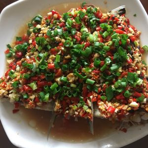 铺满整个鱼背,水烧开,下锅蒸熟大概10分钟看鱼眼翻白浮上来,鱼熟
