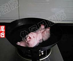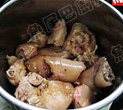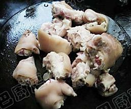 锅洗净,大火烧热,放入姜片爆香,倒入猪手,煸干水份。