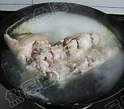盖上锅盖,大火煮5分钟左右,以便把猪手的油和未刮干净的污垢逼出来。