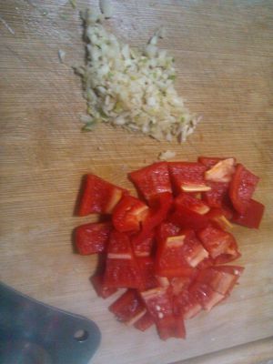 蒜切成末,彩椒切块。将半勺盐、两勺糖、两勺醋、半勺生抽、半勺老抽、两勺料酒、一勺淀粉、少许香油搅拌均匀成调料汁。