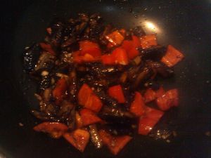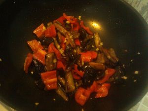 将煸茄子多余的油敝出,留少许油烧热,将彩椒和蒜末加入锅中煸炒1分钟。