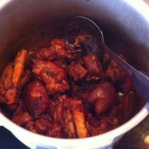 高压锅上汽后,压半个小时。打开锅盖后放入盐调味,再煮五分钟收汁就完成了。