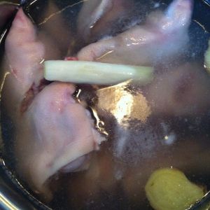 锅中烧开水,放入姜片,葱段,倒入少许料酒,放入猪蹄,煮去血水,浮末。水开煮三四分钟就可以了。