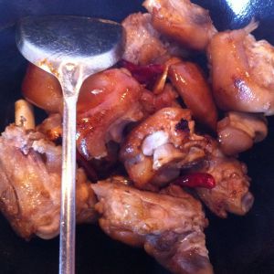 锅中放油,放入冰糖,小火熬化,放入沥干水分的猪蹄,翻炒,使每块猪蹄都能沾匀糖液。放入尖椒、葱、姜片,炒一会儿,加入清水。