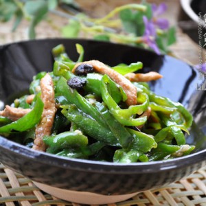 青椒洗净去蒂去籽切条丝状备用;独蒜去皮切成茸状备用;干豆豉浸泡后稍加剁碎备用;