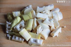 春笋清洗干净后剥除外壳。把春笋切成块。