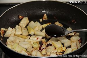 炒到春笋完全上色,酱已经融入到春笋里就差不多了,淋上点香油,放一点鸡