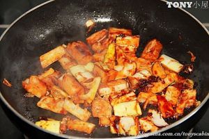 加入一勺海鲜酱改小火继续煸炒两分钟。
