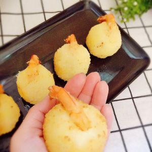 土豆泥中放少许盐,包裹住虾身,留出虾尾