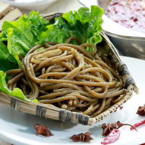8.倒入粉丝,再次沸腾后,改小火,煮至粉丝熟软,将煮好的粉丝捞出置于碗中,将酸豆角、花生米、香菜叶撒在表面;最后依个人口味调入陈醋,浇上汤汁,即可。