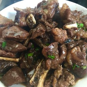 将排骨煸至金黄色后加入料酒,少许盐,酱油,老抽,冰糖,李锦记排骨酱,加入少量的水,放入高压锅中烧熟