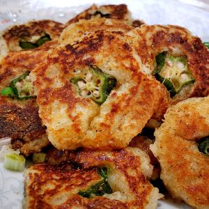 把土豆泥团城一个个小球按扁 把秋葵按在胸口